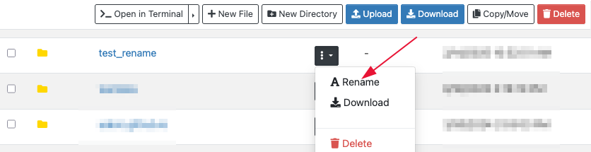 - File and Folders List: The interactive area allows you to open folders or select files, where you can view, edit, rename, download, or delete them. For example, to rename a file, click the three-dot menu next to its name in the unlabeled Actions column, select Rename, and enter the new name.